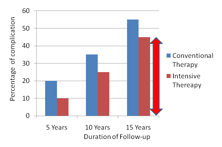 The figure below illustrates the benefit of current intensive therapy, as well as the residual risks (red arrow, after 15 years of follow-up) of complications in diabetes patients.